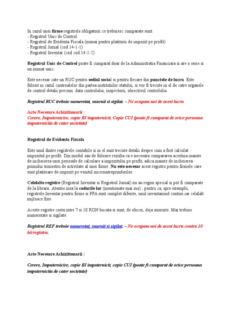 Registrul unic de control se achizitionează în 30 zile de la înființarea entității, pentru sediul social și pentru fiecare punct de lucru sau știu că ți se pare că achiziționarea registrului unic de control este una din cele mai aberante obligații pe care o ai, în calitate de antreprenor la început de drum. Cererea se depune la anaf pentru obtinerea registrului unic de control. Ce este registrul unic de control ➦care sunt actele necesare. Registru unic de control se pastreaza la sediul social si la fiecare sediu secundar pentru care exista avize/autorizatii de functionare inregistrate la onrc. Registru unic de control trebuie pastrat la sediul social al firmei.